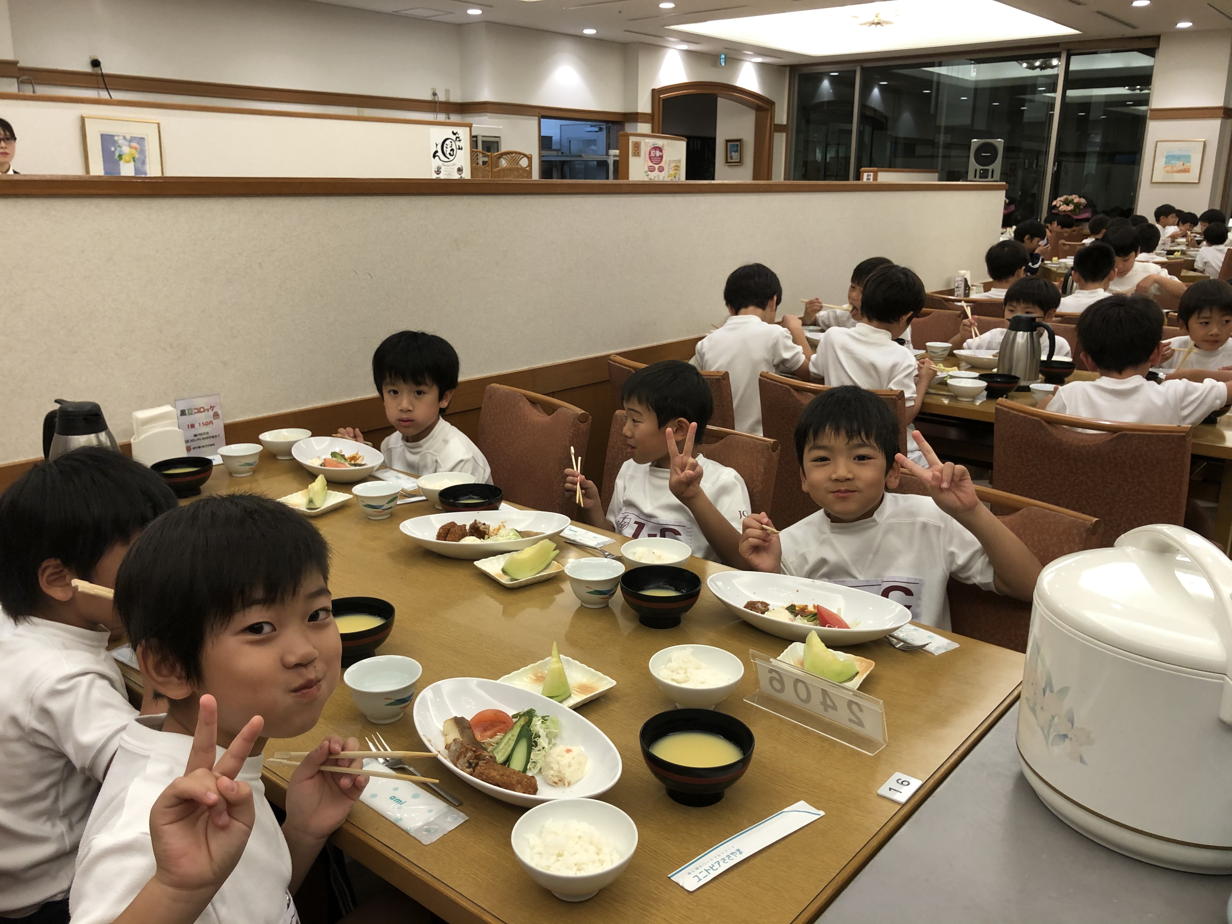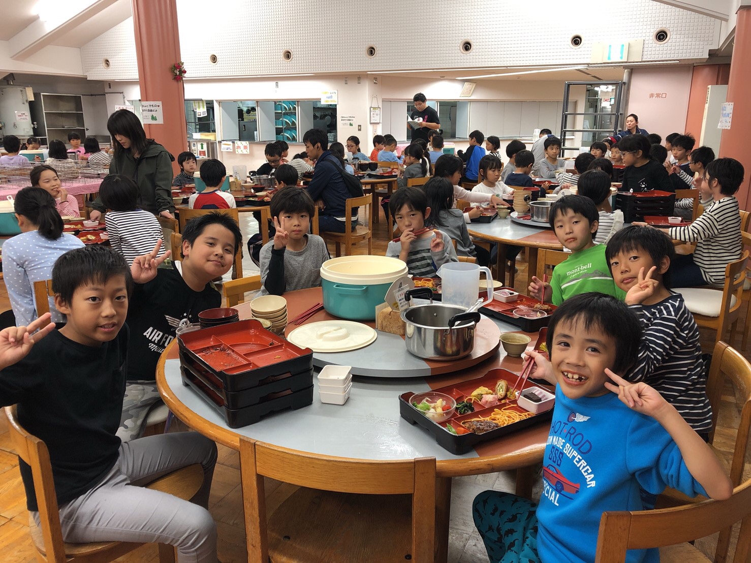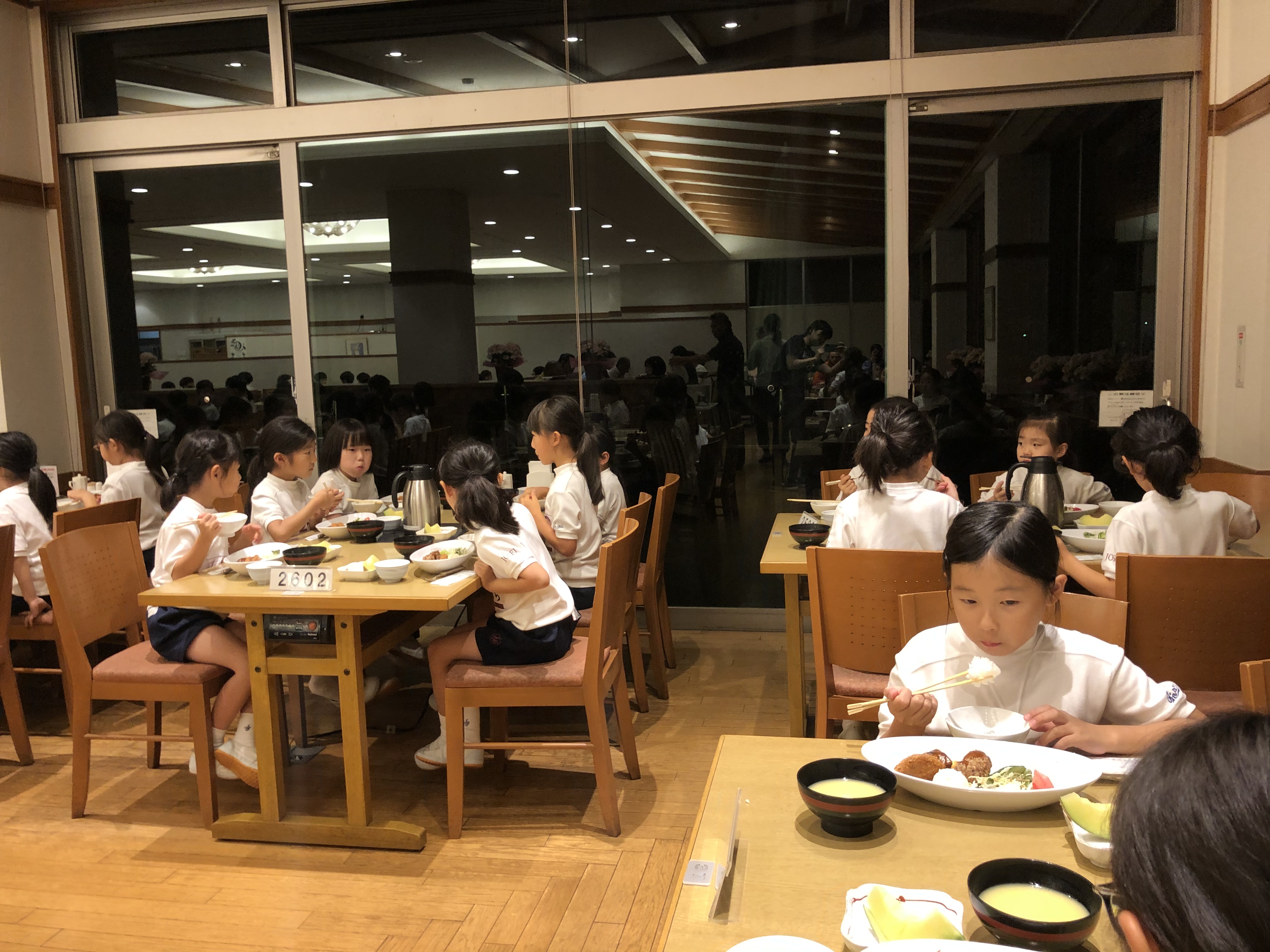 お布団をみんなで協力して敷き、今は夕飯中です。おかわりをしている子どもがたくさんいます。