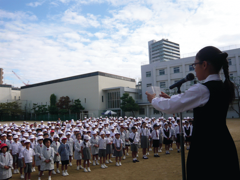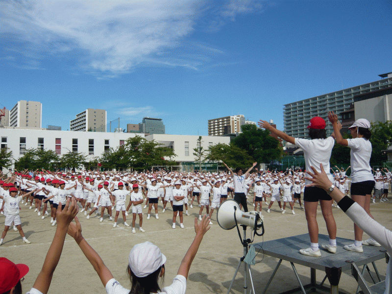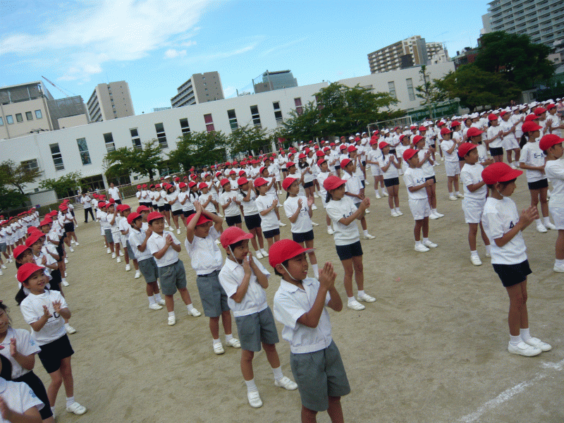 今日は運動会練習の朝会はお休み、児童朝会で9月26日に行われる「ドン・ボスコ200周年開幕式」で歌う「僕らの太陽ドン・ボスコ」の振り付けを行いました。