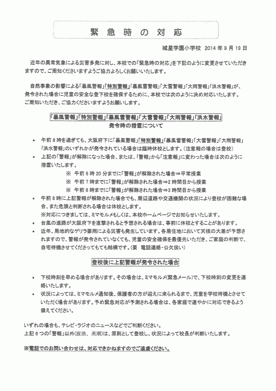 小学校入学試験合格者の皆様へお伝えします。本日予定しておりました入学手続きは、予定通り行います。お気をつけてご来校ください。