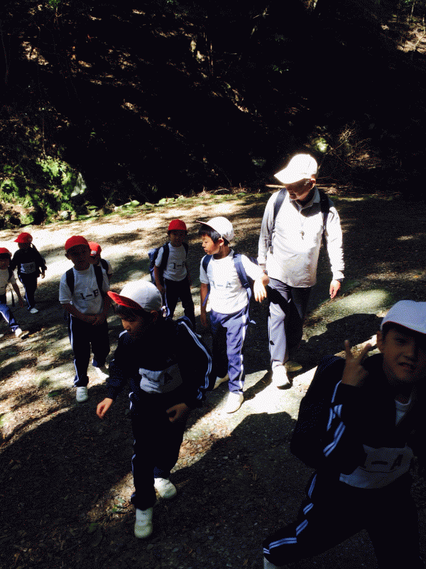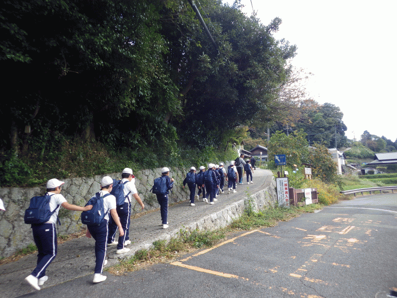 ここは「暗がり峠」日本3大酷道とも呼ばれる道。子ども達が歩いている道が国道です!この道は伊勢街道として、城星学園近くにある玉造稲荷から続いている道でもあります。