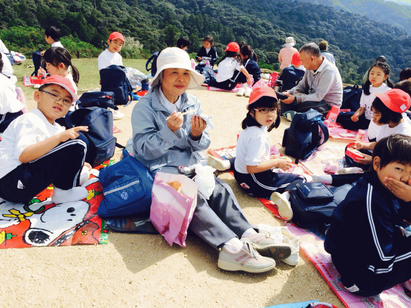 少し肌寒い朝でしたが、登っていくうちに暑くなってきました。写真は山頂でのお昼ご飯の様子です。
