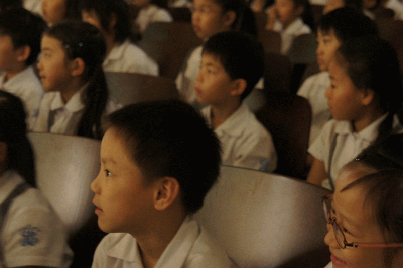 講堂に座る子どもたちの姿勢が違っていました。口を開かず背筋ピ〜ン!!