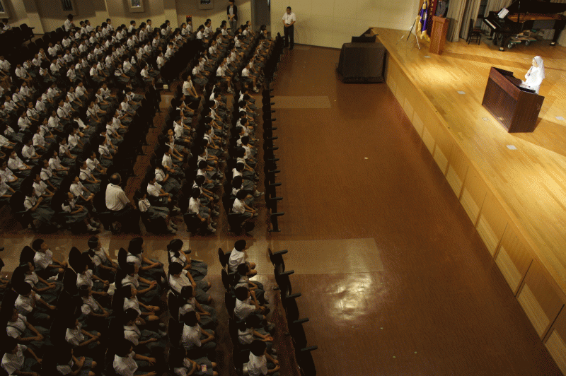 朝、祈りを持って黙想会を始めます。2学期を始めるにあたり、子どもたちのたちの成長を神に祈り一致を持って学期を開くのです。