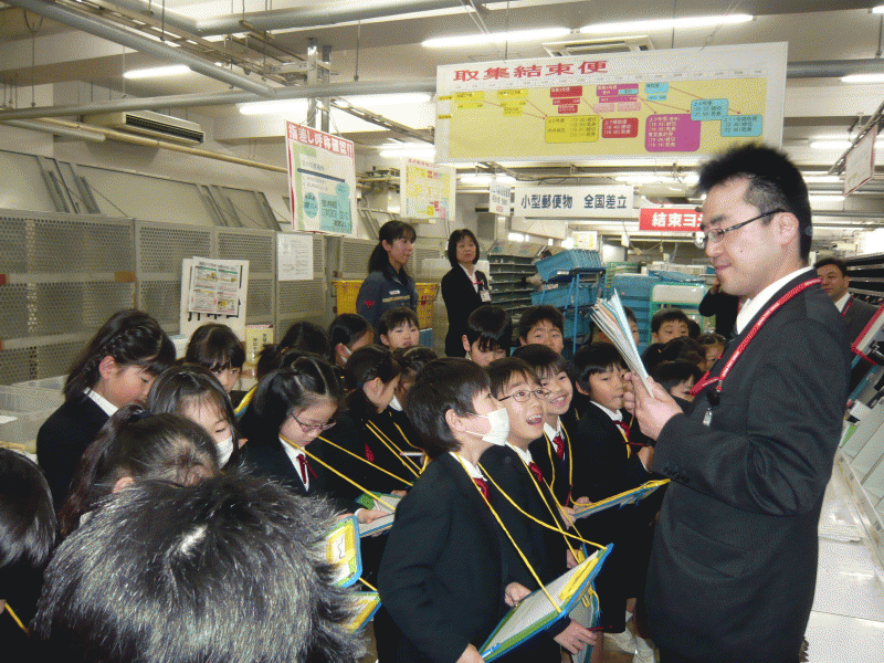 消印を昔は木づちのようなもので打っていたそうですが,今は1秒間に10通消印を押せる機械で打つそうです。みんな興味津々。