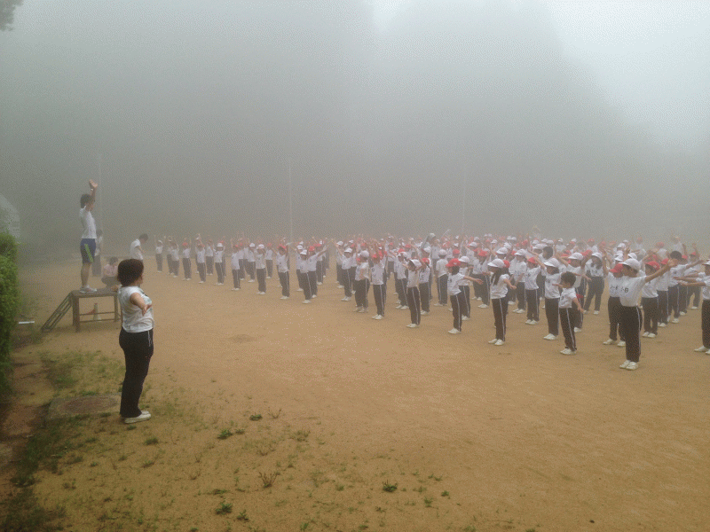 残念ながら濃い霧が立ち込めていますが、しっかり体操をして頭と体を起こしました。