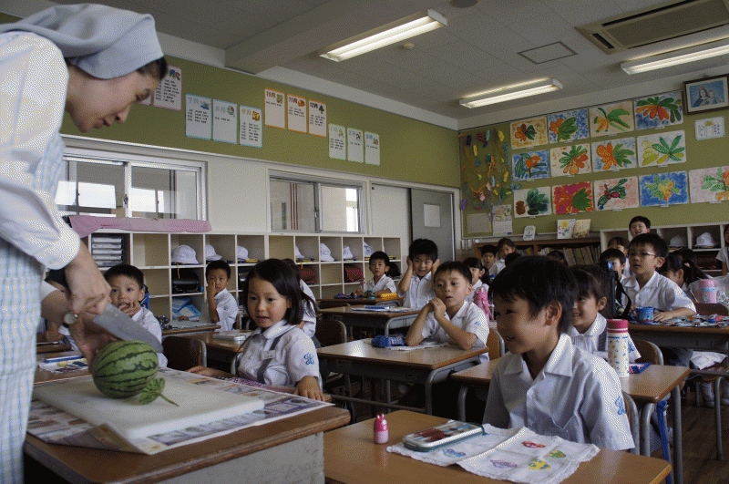 1年生の前にスイカが!「うわ〜!!」と歓声が上がります。
