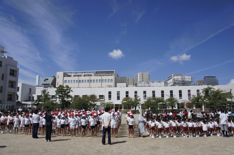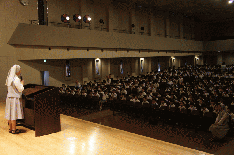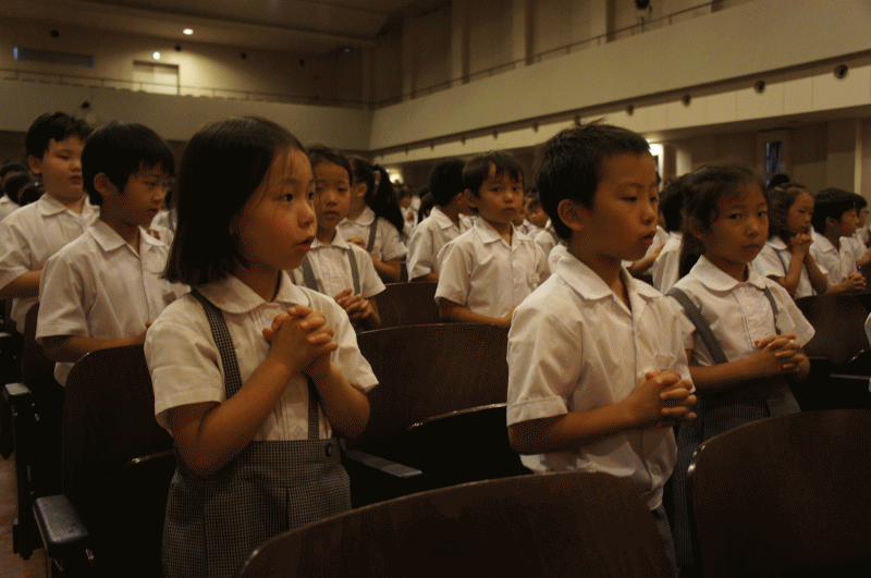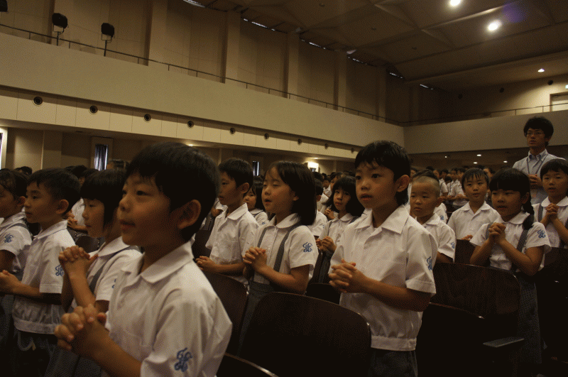 講堂に集まった子どもたち、無事に二学期を迎えられた子どもたち、感謝の祈りを捧げます。
