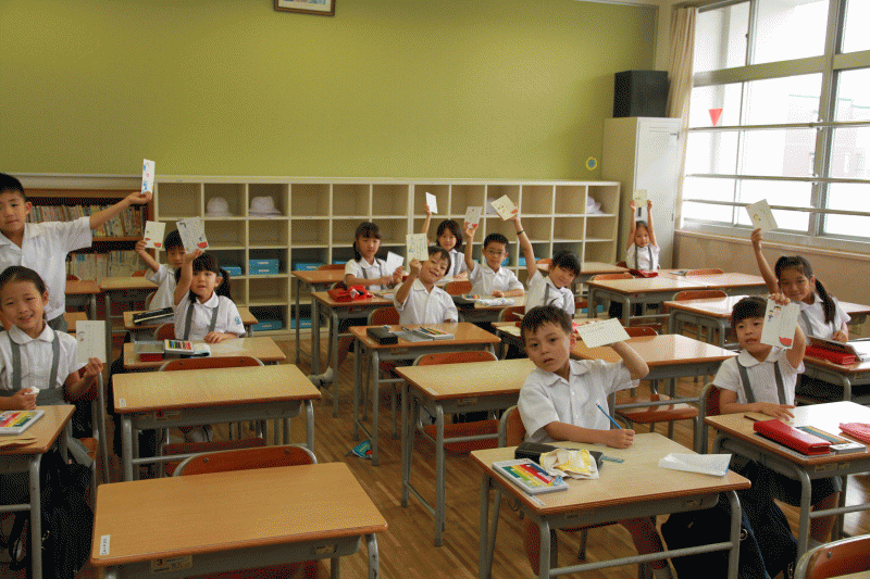 二学期から使う新しい教科書を運ぶ子どもたち。二学期も「よく遊び、よく学べ!」