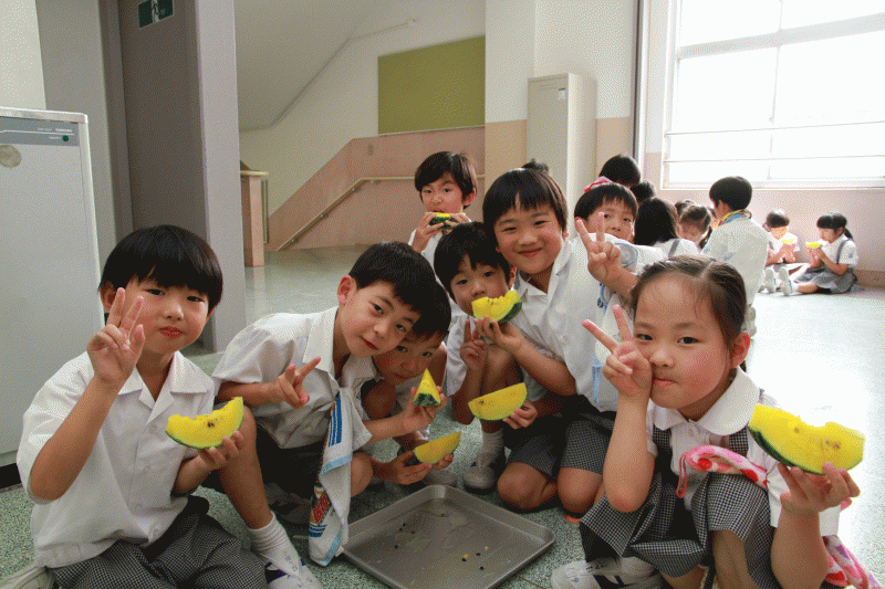今日は学級園に植えたすいかをみんなで食べようということで、1年生の希望者が学校に集まりました。