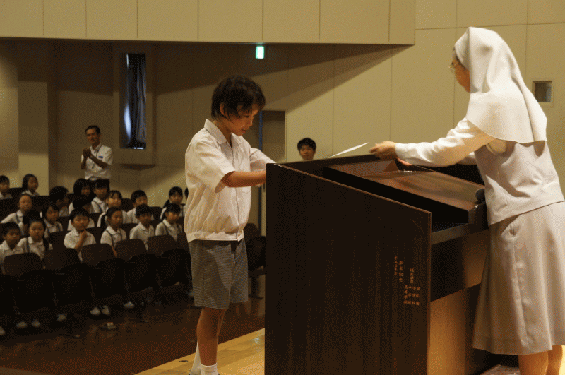 始業式では夏休みに行われた水泳記録会の表彰式が行われました。城星学園からは21名の参加、夏の水泳学習での成果を出しました。今回は代表して、100m自由形で優勝した6年生の北村龍太郎君が校長先生から表彰状を受け取りました。