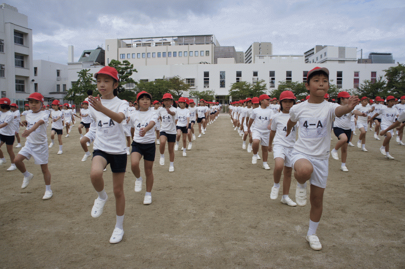 今日の朝会は、運動朝会です。9月のビッグイベント運動会に向けてさっそく練習が始まります。足踏みはじめ!1,2,1,2!