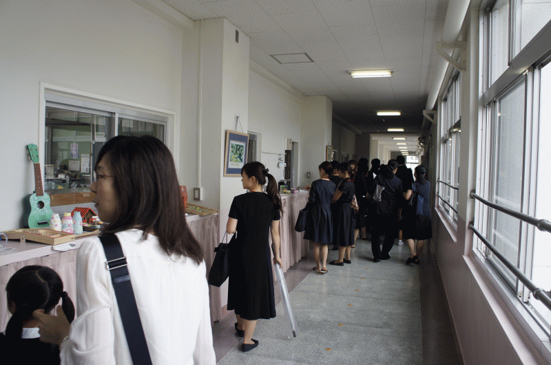 今日は夏休み作品展です、様々な工夫を凝らした作品、調べ学習をみんなで見て回ります。午前中は保護者の皆様にも公開している作品展、朝一番から見に来ていました。