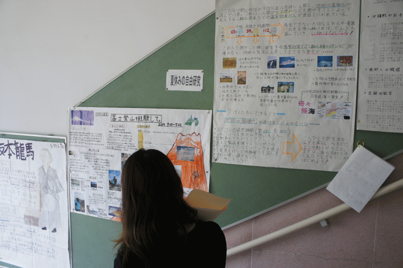 夏休みに子どもたちが作ってきた力作を足を止めて見てくださいました。様々な研究が学校の壁に掲示されています。