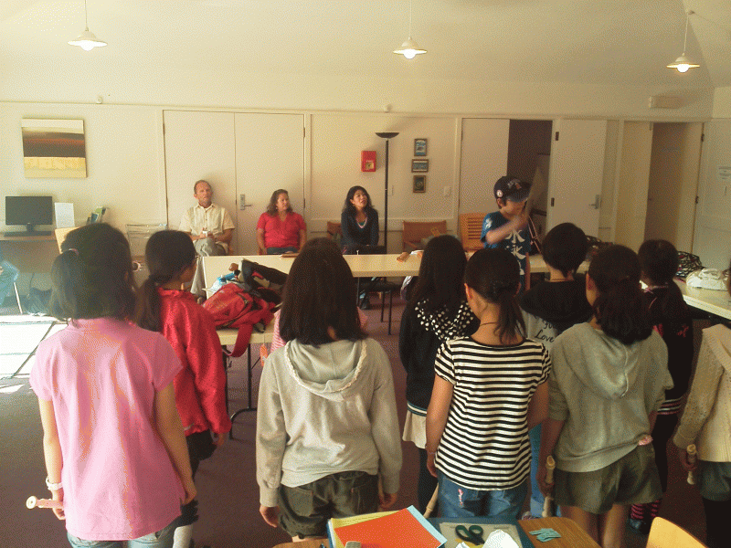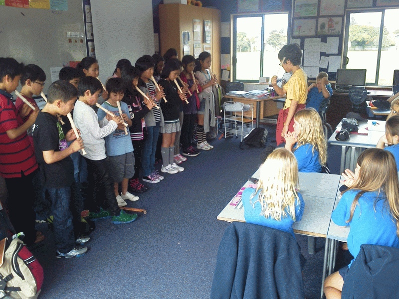 現地校とのふれあいの時間です。だいたい9歳のクラスの子どもたちに歌とリコーダーの演奏をプレゼント。そして、折り紙を教えました。言葉は分からなくても心は伝わります。