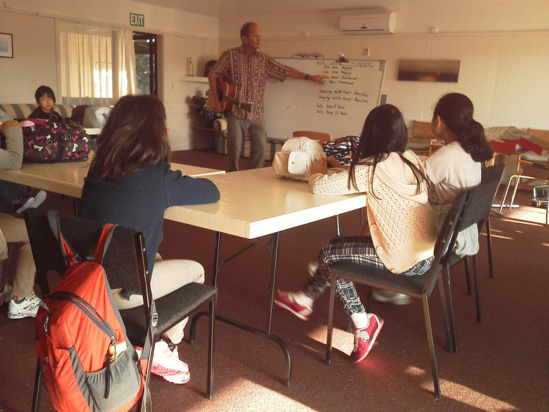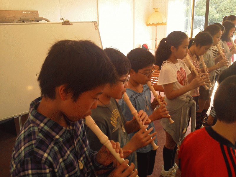 今日の天気も最高です。午前中は英語のレッスン、午後からはビーチで遊びます。その前に、ロス先生とサンディー先生にリコーダーと歌を聞いてもらいました。