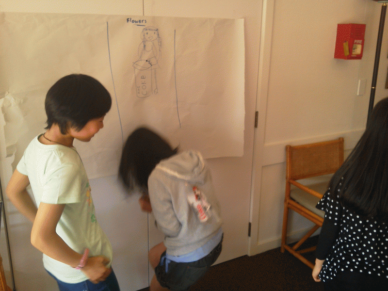 休憩時間を挟んでグループごとに分かれて英語の活動の時間。背中に張られた写真を言葉で伝えてもらって絵を描いてます。にてるかなぁ・・・。