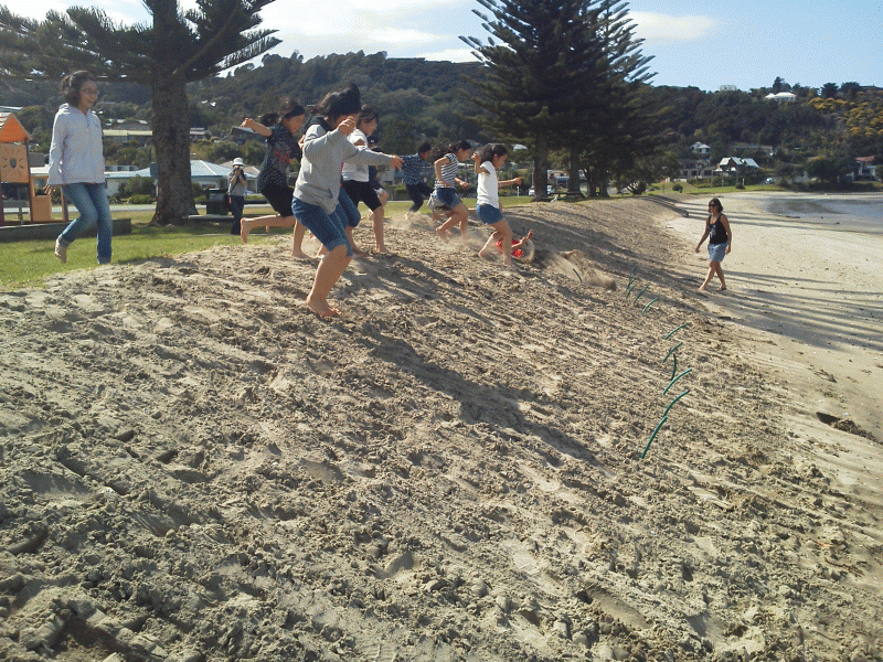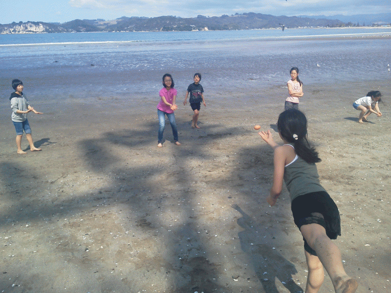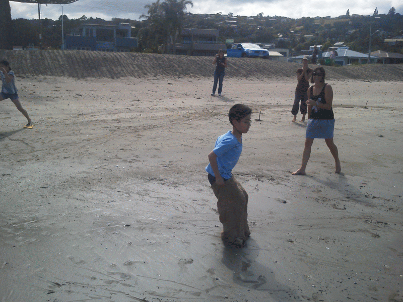 海辺でみんななでgameをして遊びました。袋に入って競争したり、卵を投げ合ったり(もうすぐイースターだからか・・・)こちらの遊びを教えてもらいました。袋に入って競争するのがサックgame?という遊びらしい。運動会で障害物競走などでやるアレですね。
