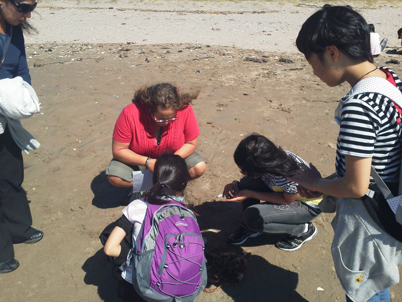 午後からは、ビーチにいって海のものについて英語で学びました。貝、海藻、ヒトデなどいろんなものが砂浜に落ちています。集めて名前を調べました。