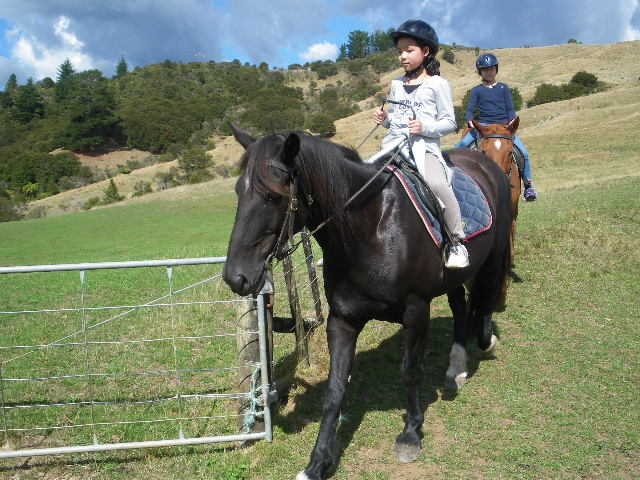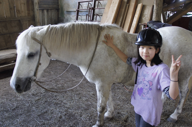 馬とのふれあい心ときめかせ、やってきました。自分の馬の名前を覚えてご挨拶。乗り方も教わったとおりにやってみました。坂道を下るのがちょっと怖かったけど無事にみんな上手に乗りこなしました。