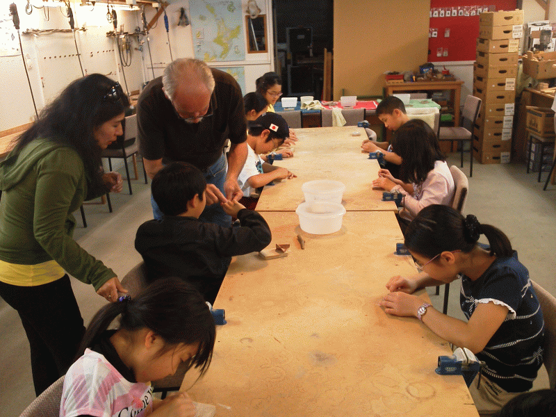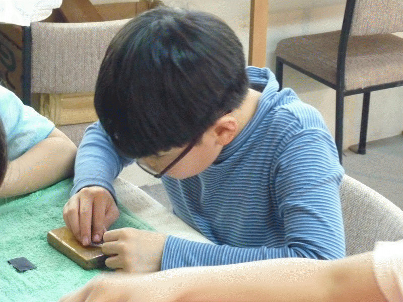 もう一つのチームは、ボーンカービングです。牛のすねの骨を削りかざりに仕上げていきます。みんな念入りに磨きをかけていました。