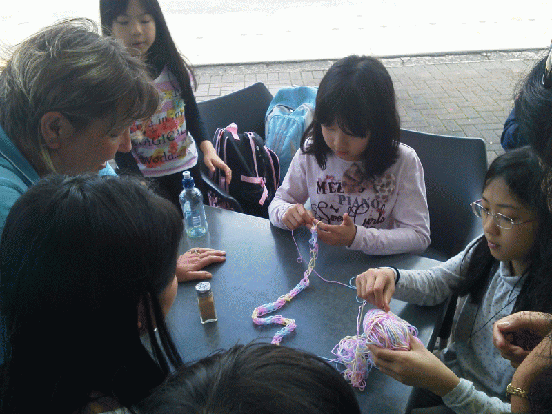 子どもが編み物をしている姿がこの国ではめずらしいらしく店員さんも思わず質問。「どこで覚えたの?」「なにができあがるの?」