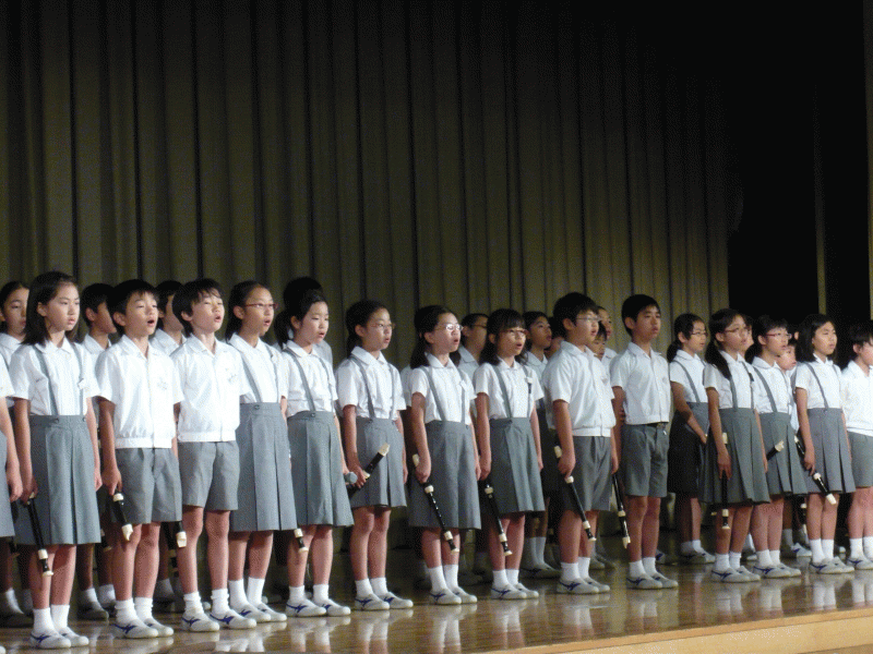 今日は音楽朝会が行われました。2年生と5年生合同の音楽発表です。