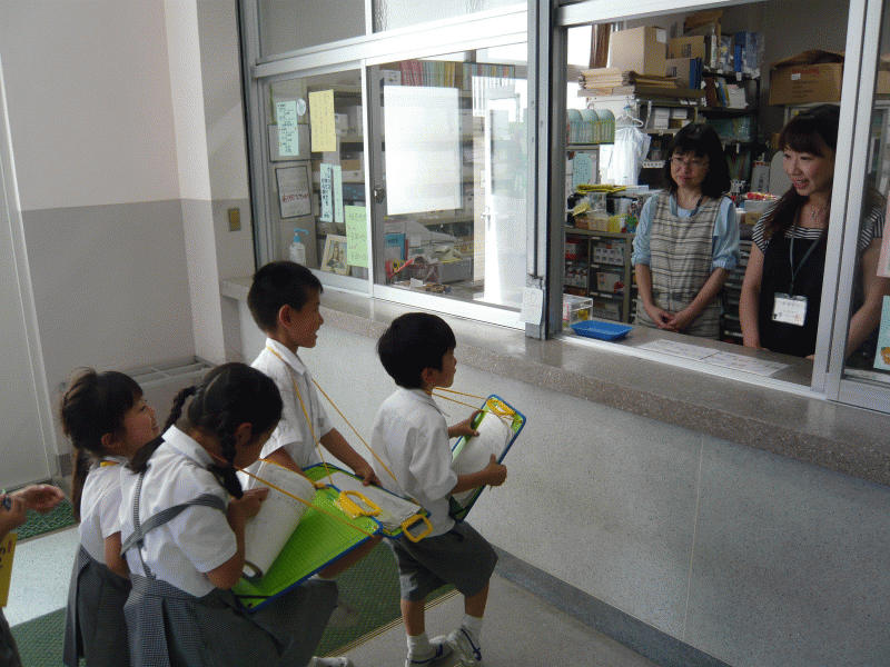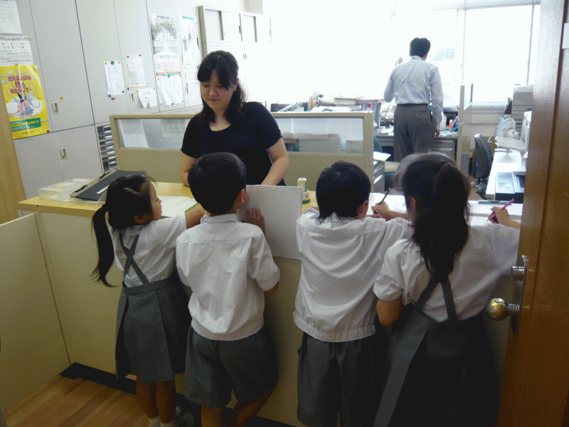 今日、1年生は学校で働く人たちを探しに行きました。