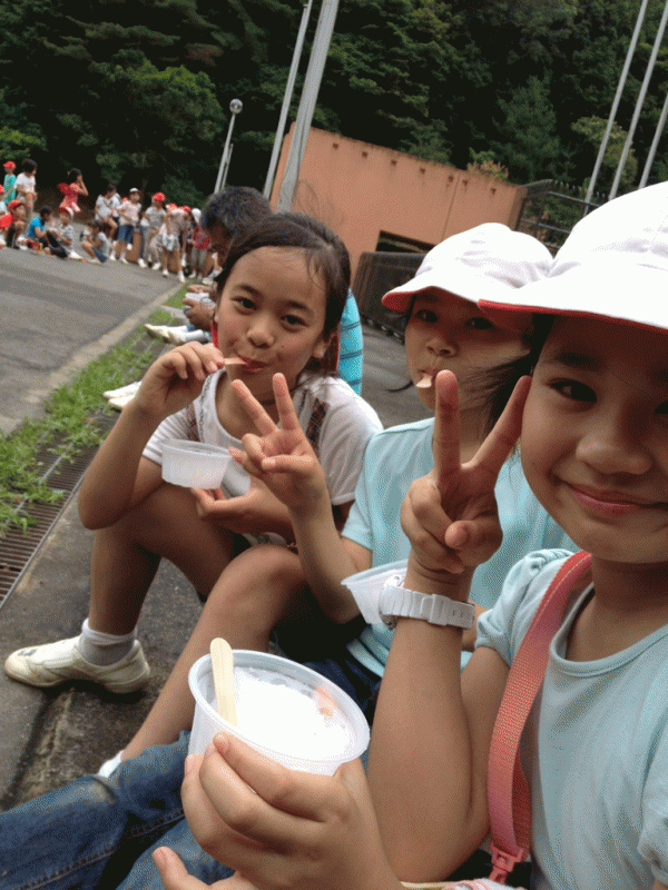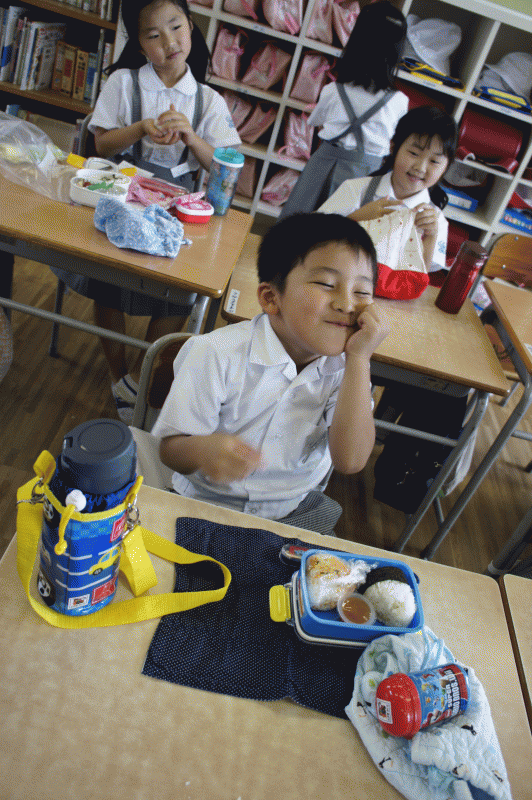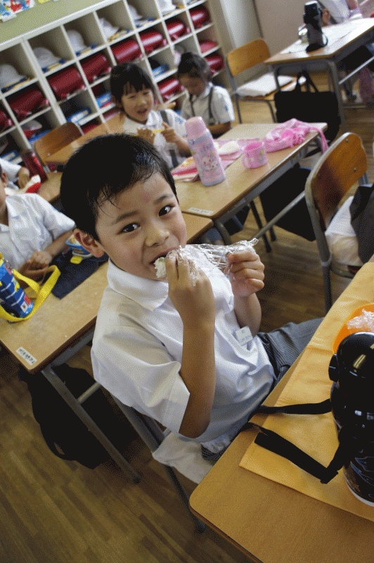 今日は1学期最後のおにぎり弁当。梅雨の晴れ間で元気に遊んだ子どもたちは、おにぎりを口いっぱいにほおばっていました。