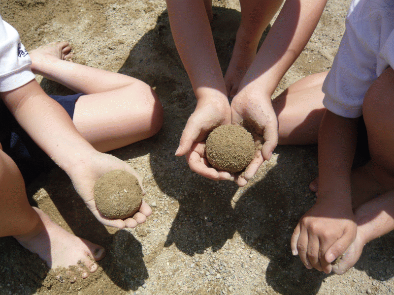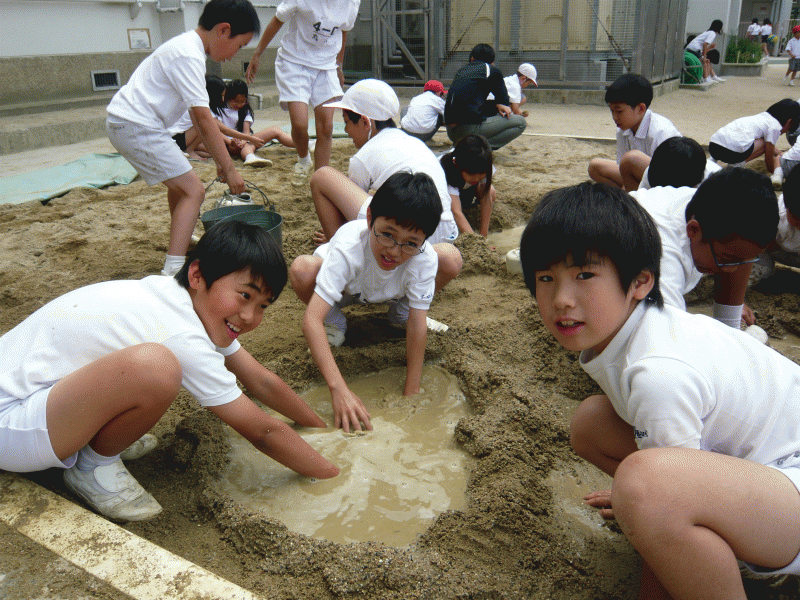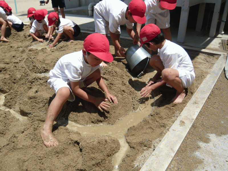 子どもたちは砂場で大きな山を作ったり、川を作ってみたり。まさに天地創造!