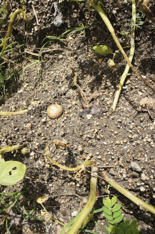 雨で流された土の中から、小さなジャガイモが顔を出しています。