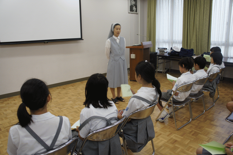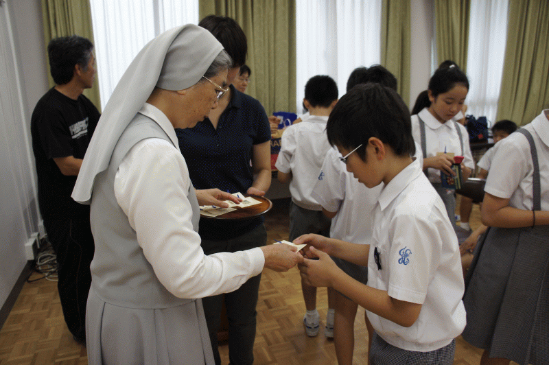 元気な声で聖歌「感謝とともに」を歌います。この1学期で受けたお恵みに感謝をします。