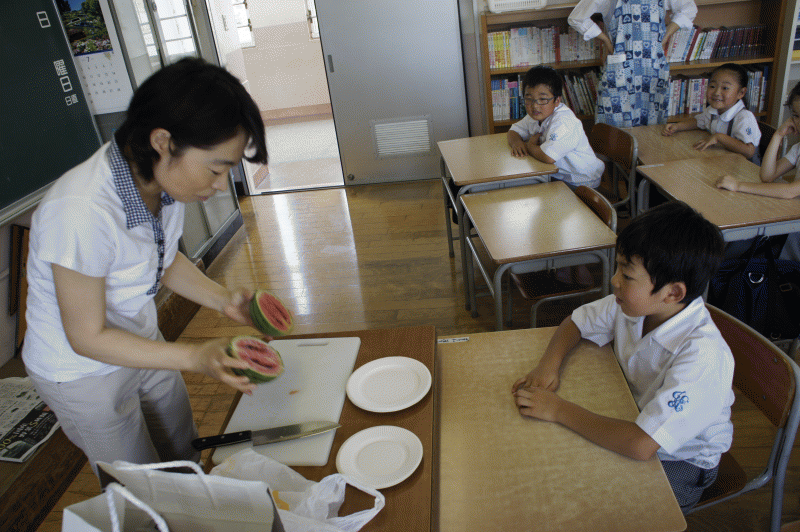 何より子どもたちが楽しみにしていたのは、学級園で育てた小玉スイカを食べること!