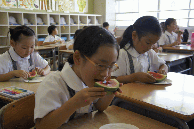 あま〜い!!冷たく冷やしたスイカを食べる子どもたち。これも夏の思い出ですね。