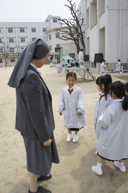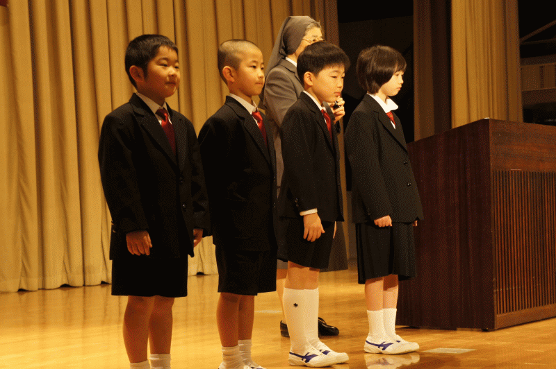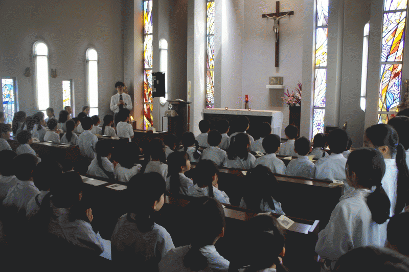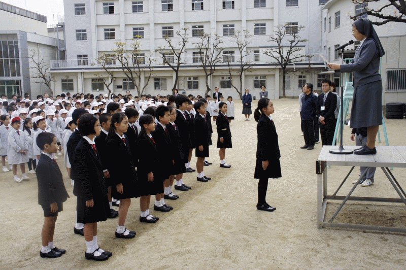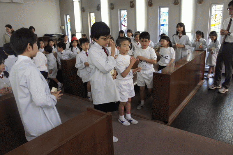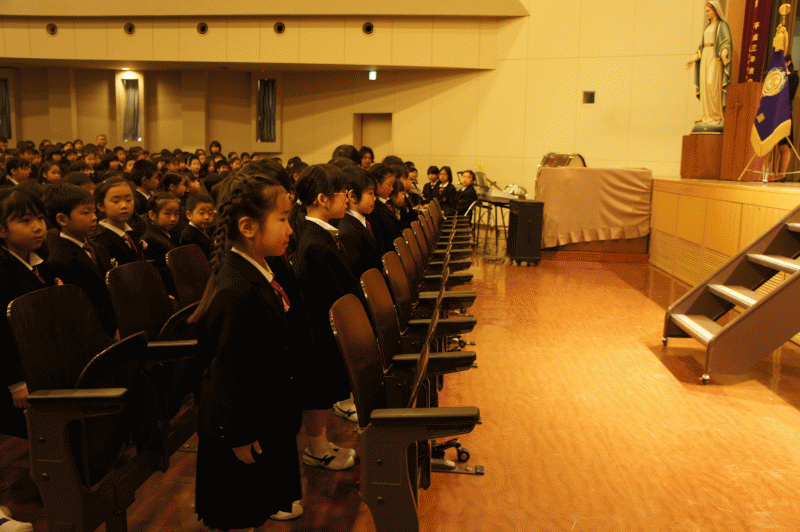 今日は宗教朝会、1年生は今日から外での朝会に参加しました。