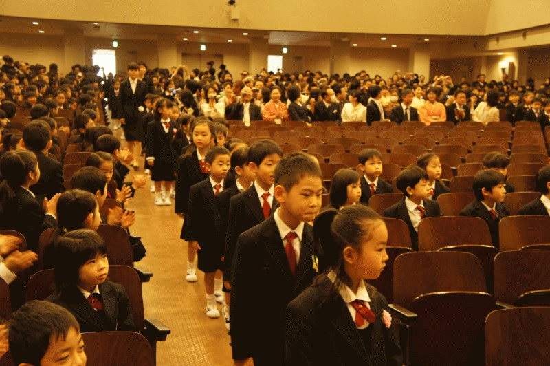 いよいよ入学式、大きな拍手に迎えられて子どもたちが入場します。