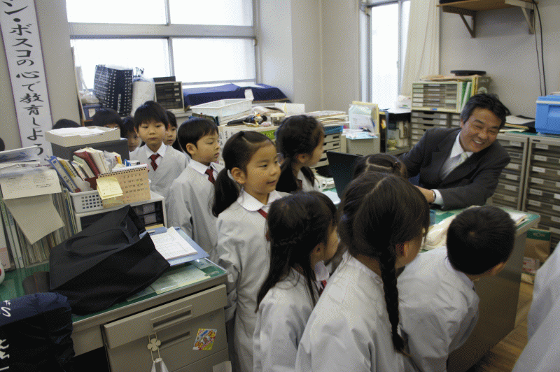 先生がいつもお仕事をしている職員室、「失礼します」としっかり挨拶をしてから入ります。教頭先生がにこやかにお出迎え!