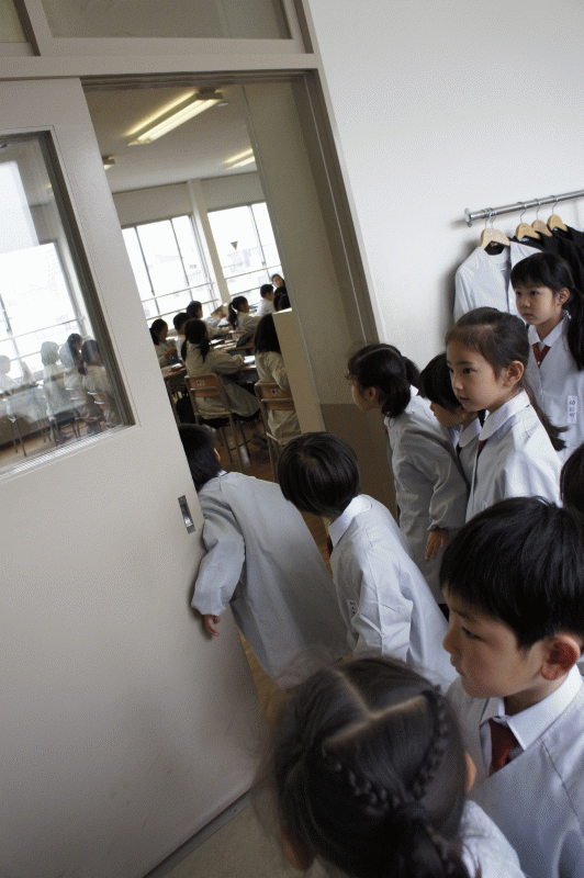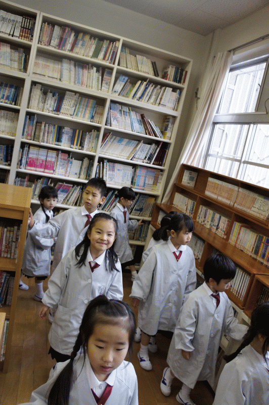 今日、一年生は学校探検にでかけました。