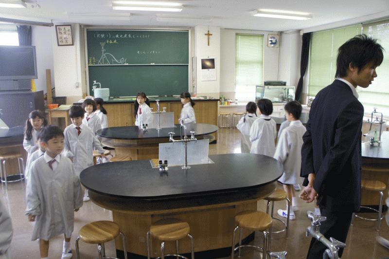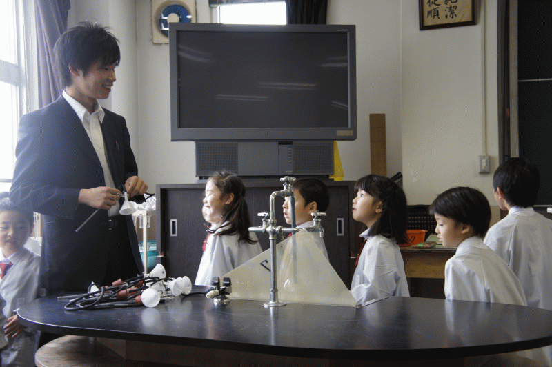 理科室では3年生になったらいろんな実験をします。男の子からは「早く実験した〜い」「1年生も理科したい!」という言葉が、もうちょっと我慢してね。
