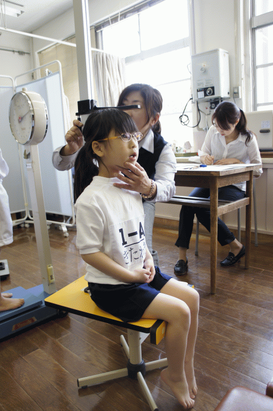 背筋をぴんとのばして座高の測定、まだ足がぶらぶら床につきません。