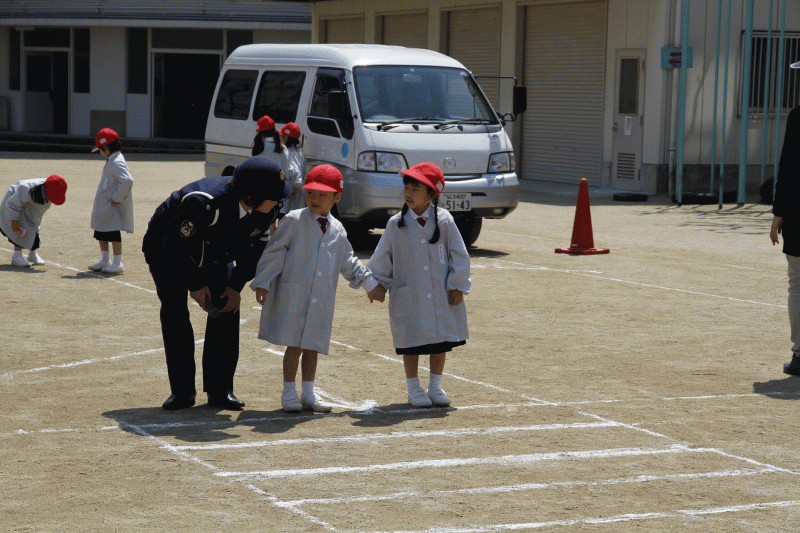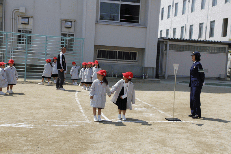 東警察署の交通課から婦警さんに来ていただき、道路の安全な歩き方を教えていただきました。