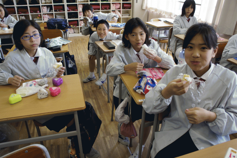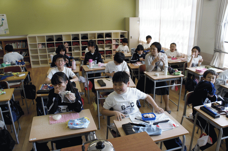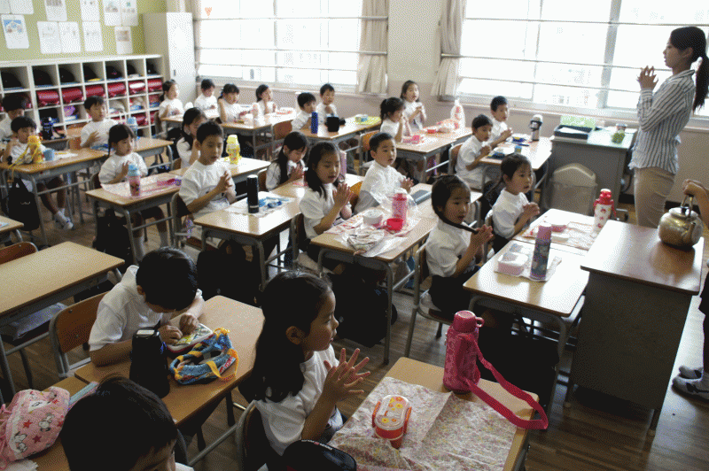 1年生は今日はおにぎり弁当ではありませんでした、しっかりとお祈りをしてからお弁当をほおばります。